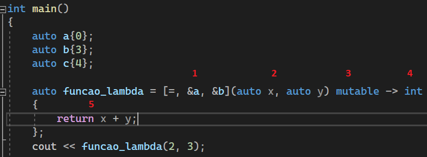 [=, &a, &b\]Introdutor lambda (lambda introducer) ou bloco de captura (capture block)- O que vem dentro dos colchetes são as variáveis que serão capturadas dentro do escopo.
