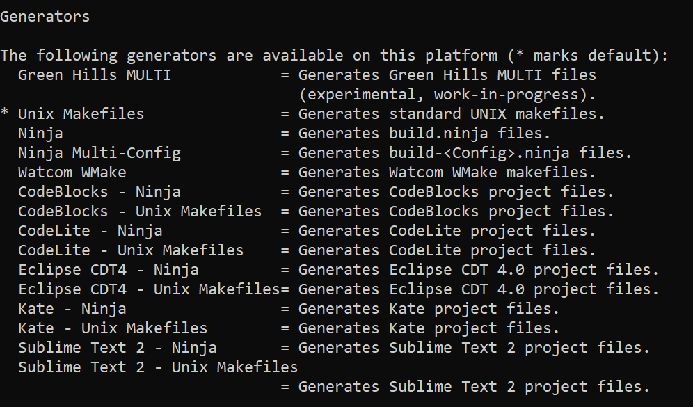 Usuários do linux estão mais inclinados a escolherem Unix Makefiles ou Ninja, enquanto usuários do windows tem a tendência de escolherem build para a sua IDE favorita. Podemos ter uma lista dos generators suportados pelo cmake com executando o comando